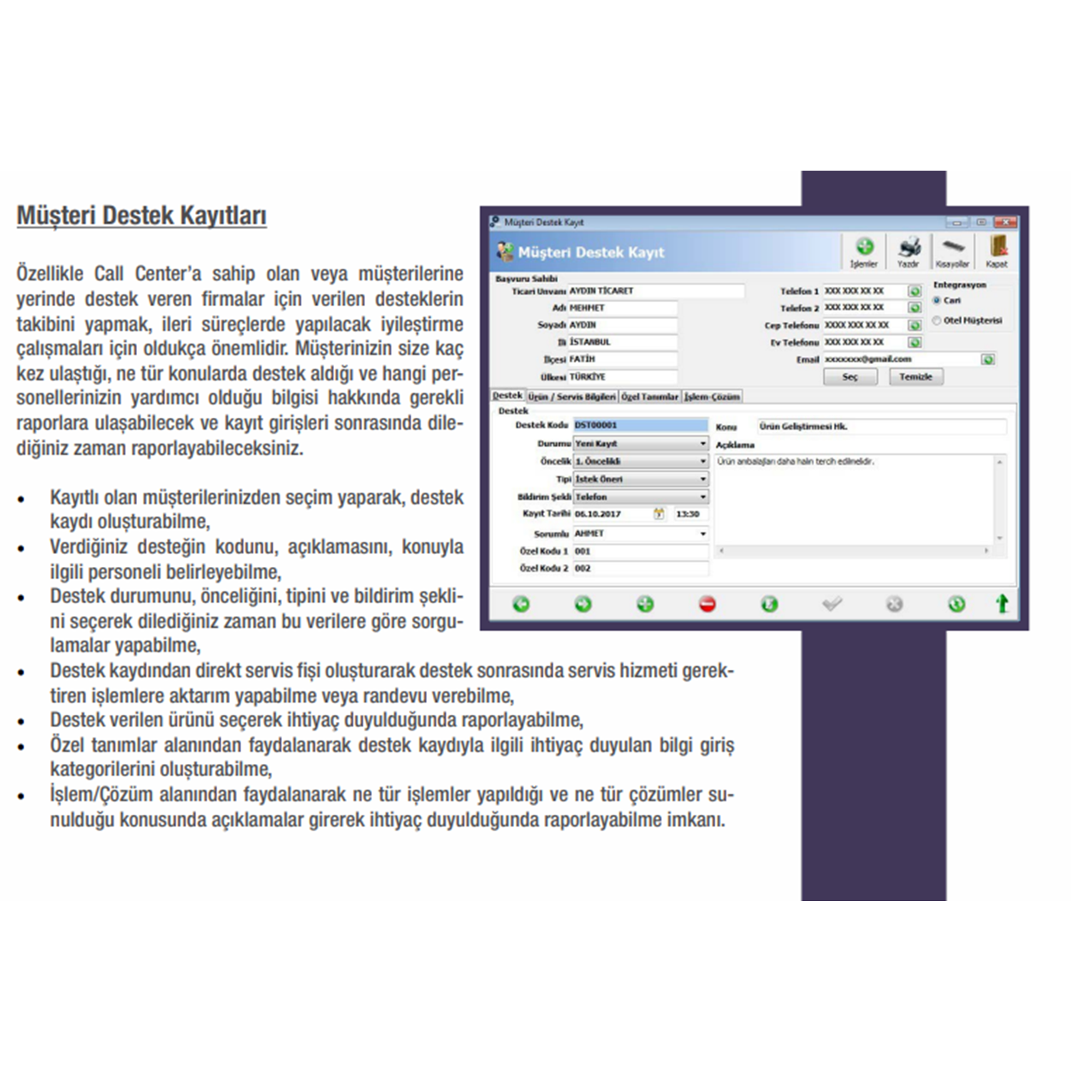Wolvox CRM Paket-1 Wolvox ERP Cari 1 (1 Kullanıcı) Kasa (1 Kullanıcı) Stok 1 (1 Kullanıcı) Fatura (1 Kullanıcı) e-Fatura / e-Arşiv / e-İrsaliye / e-Müstahsil / e-Adisyon (Modülü kullanmak için AKINSOFT kontör bakiyenizin olması gerekir.) İrsaliye (1 Kullanıcı) Teklif (1 Kullanıcı) Sipariş (1 Kullanıcı) Transfer Finansal Analiz CRM (1 Kullanıcı) Şirket Sayısı (1 Şirket) Kullanım Alanları CRM (Müşteri İlişkileri Yönetimi) e önem veren tüm işletmeler için. İçerdiği Modüller AKINSOFT WOLVOX CRM Programı , WOLVOX Erp' nin bir parçasıdır ve tam entegrasyonludur. Öne Çıkan Özellikler * Müşteri listesi oluşturarak liste bazında toplu işlem yapabilir, * Kampanya tanımları oluşturarak kampanya planlamalarını ve sonuçlarını tutar bazında karşılaştırabilir, * Proje ve satış takip kayıtlarını oluşturarak kampanyalarla ilişkilendirebilir, * Caller ID desteği ile arayan müşterilerinize hızlı bir şekilde aktivite kaydı açabilir, * Anket kayıtları oluşturabilir, anket girişleri yapabilir ve anket raporları alabilir, * Aktivite tipi, destek tipi, bildirim şekli, destek durumu, destek önceliği ve sektör tanımları oluşturabilir, * Organizer özelliği sayesinde tüm toplantı, randevu, yapılacak iş ve benzeri aktivitelerinizi kayıt edebilir, * Ajandanızı görüntüleyebilir ve hangi gün ve saatlerde dolu olduğunuzu tek ekran üzerinden izleyebilir, * Uyarı sistemi sayesinde aktivitelerinizi belirttiğiniz saat öncesinde sesli ve görüntülü uyarı vermesini sağlayabilir, * Müşterilerinize verdiğiniz teknik destekleri kayıt altında tutabilirsiniz.